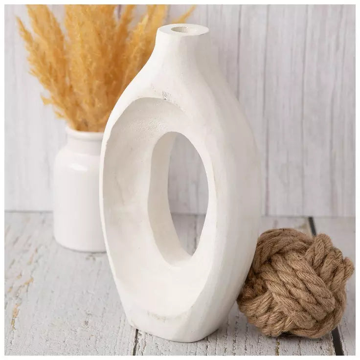Completa la decoración de tu habitación boho con este jarrón pequeño de madera de Paulownia con forma de donut. Tiene forma ovalada con un acabado tallado y un corte abierto en el centro. La abertura superior es corta para que puedas exhibir fácilmente una púa artificial. Combínalo con más elementos de madera para lograr un look coordinado y elegante.
