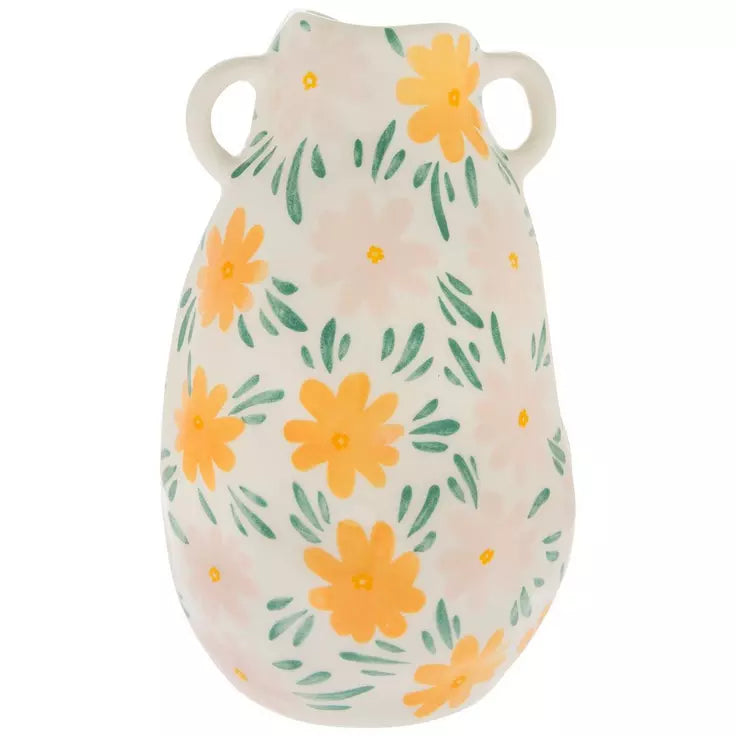 Dale un toque de estilo a tu dormitorio con este jarrón floral rosa y naranja. Este singular jarrón presenta una cautivadora forma ovalada con dos pequeñas asas cerca de su abertura redonda en la parte superior. Su cuerpo blanco está decorado con flores rosas y naranjas con preciosas hojas verdes. ¡Coloca un pequeño ramo de flores artificiales en su interior para crear un bonito centro de mesa!
