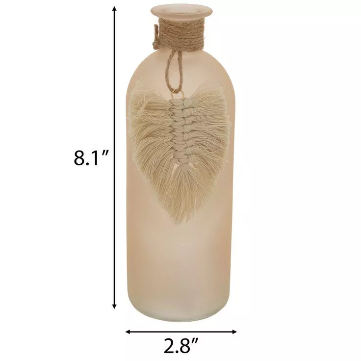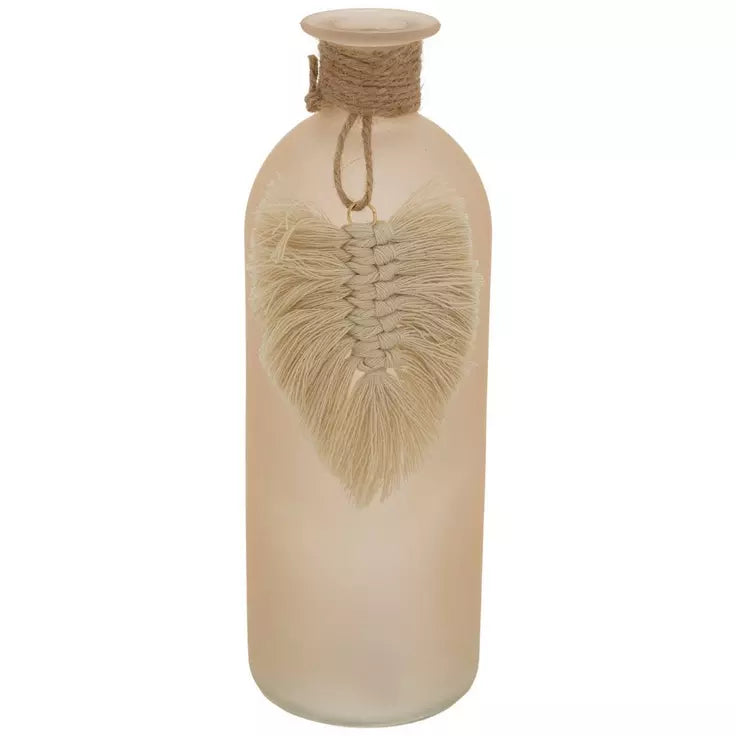 Completa tu espacio bohemio con detalles decorativos como este jarrón rosa esmerilado con borla de hojas. Este pequeño jarrón está hecho de vidrio, presenta un acabado rosa claro esmerilado y un cuerpo cilíndrico. Tiene un cordón de yute atado alrededor del cuello corto, con una borla en forma de hoja. Colócalo solo junto a otros elementos decorativos neutros o coloca un tallo floral artificial en su interior.