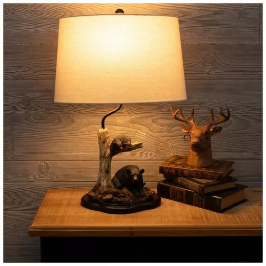 ¡Ilumina tu acogedora cabaña con esta lámpara Lazy Bears! Esta encantadora lámpara de mesa luce una base marrón oscuro con aspecto de madera y forma orgánica. Sobre ella se encuentra una escultura de resina de un osezno negro descansando en un árbol y su progenitor tumbado debajo. El árbol está grabado y pintado para una apariencia realista, y la lámpara se completa con una varilla metálica curva y una pantalla ovalada. Añade una bombilla compatible y colócala en tu sala de estar o dormitorio.