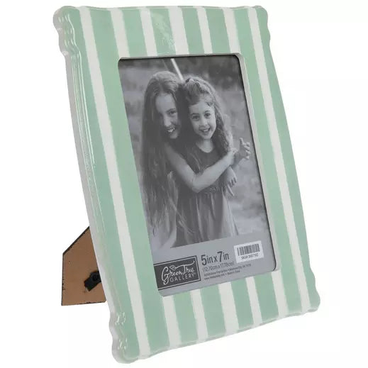 Muestra un recuerdo maravilloso con este marco de fotos de rayas verdes y blancas. Este marco presenta un patrón brillante de rayas verdes y blancas con esquinas ligeramente onduladas. El panel de vidrio frontal mantendrá tu fotografía segura. ¡Agrega una foto de tus hijos o de una divertida acampada!